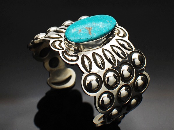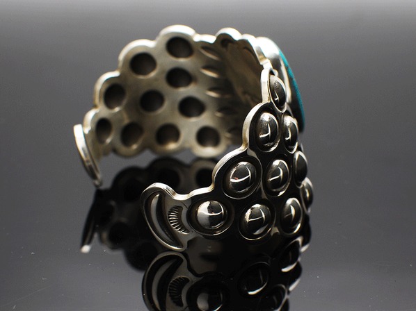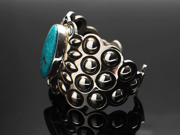 インディアンジュエリーのリボーズ技法(裏からシルバーを叩き出してデザインを作り上げる)でモダンに