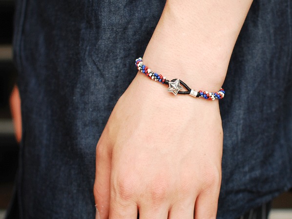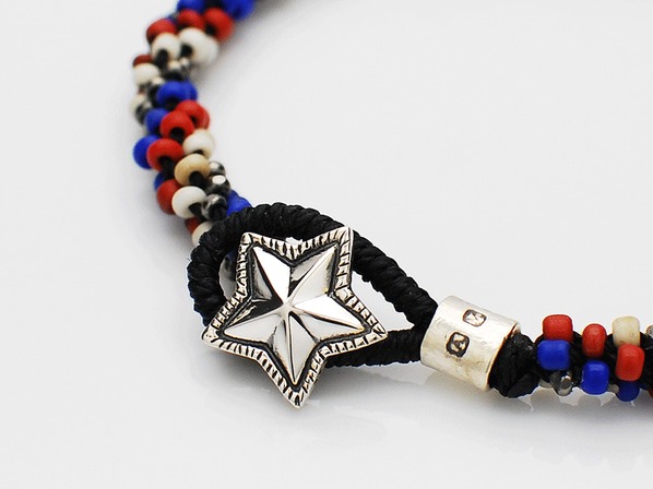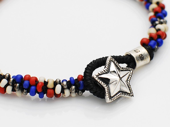 ◆リボウズで抜き出したシルバー製スターコンチョに、トリコロールカラーのグラスシードビーズを