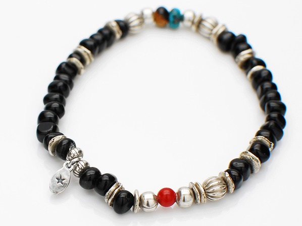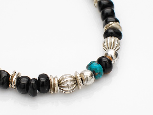 ◆ブラックアゲートを中心に不揃いな天然石ビーズ、そしてアクセントとしてシルバーコーティングを
