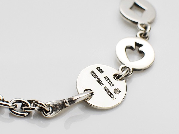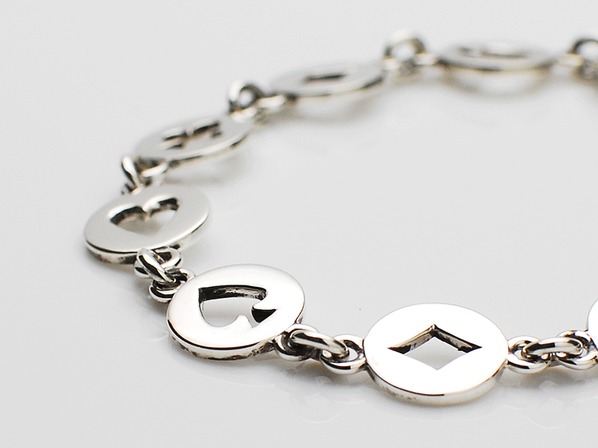 ◆丸型パーツの中心をスペード・クラブ・ハート・ダイヤの4つのモチーフをくり抜いたシルバーブレスレットです。