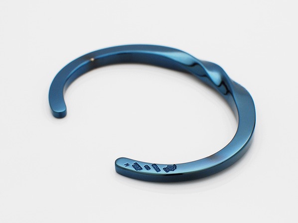 ◆表は裏の正反対ではない=常識は常識ではない。表裏一体や固定概念からの解放を意味するメビウスの輪をモチーフにしたブルーチタンのバングルで、中央にはブランドネームが刻印されています。