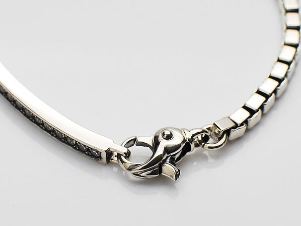 ◆手首のアールに合わせたフォルムで表現したIDブレスレットで、ジルコニアで埋め尽くしたプレートに太めのベネチアンチェーンを合わせ存在感のあるKLオリジナルのクリップがアクセントになっています。