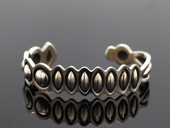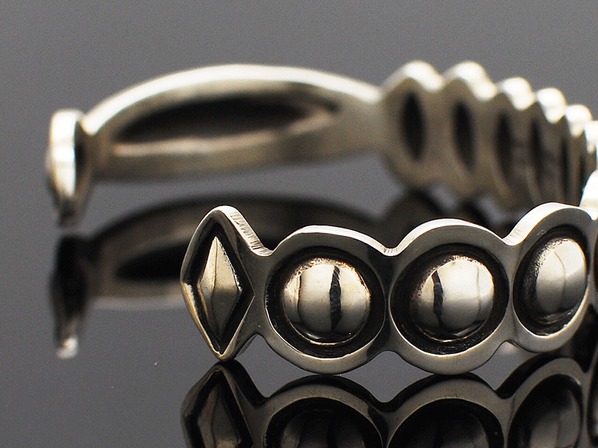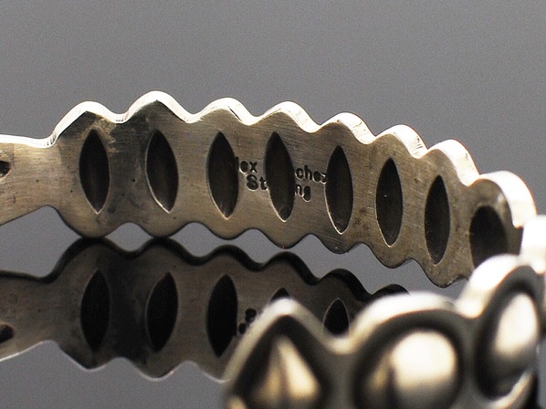 ◆ナバホ族とズニ族のハーフで、ペトログリフ(壁画)デザインのジュエリーを得意とする同氏が、伝統的なインディアンジュエリーのリボーズ技法(裏からシルバーを叩き出してデザインを作り上げる)でモダンに昇華させた珠玉の逸品。