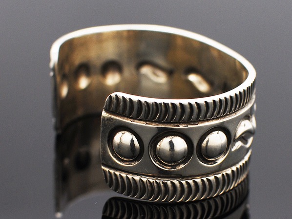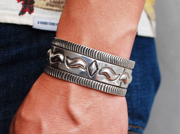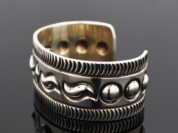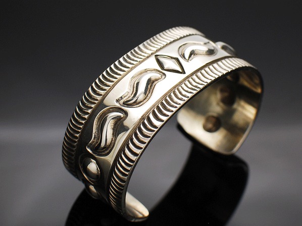 ◆ナバホ族とズニ族のハーフで、ペトログリフ(壁画)デザインのジュエリーを得意とする同氏が、伝統的なインディアンジュエリーのリボーズ技法(裏からシルバーを叩き出してデザインを作り上げる)でモダンに昇華させた珠玉の逸品。
