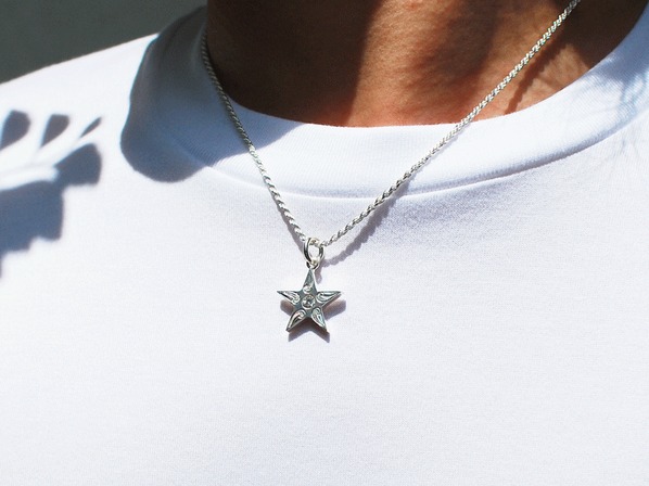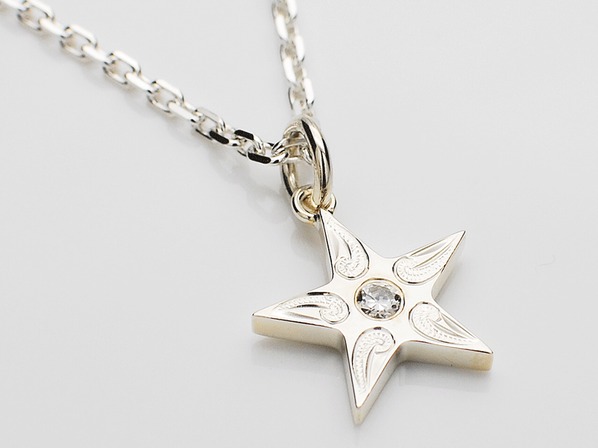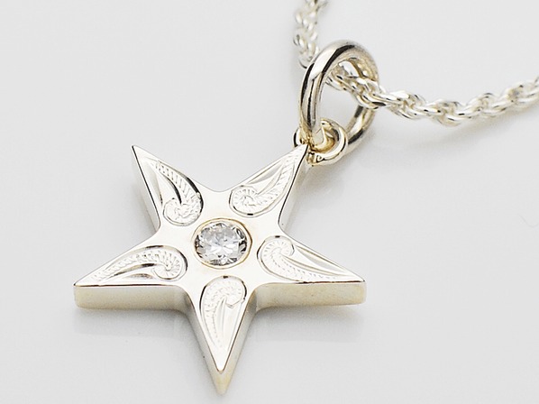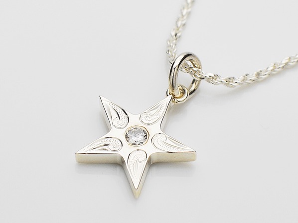 ◆夜空に輝く星をモチーフにしたペンダントで、彫り模様には永遠に続く幸せを意味する『スクロール(波)』の柄が刻まれています。