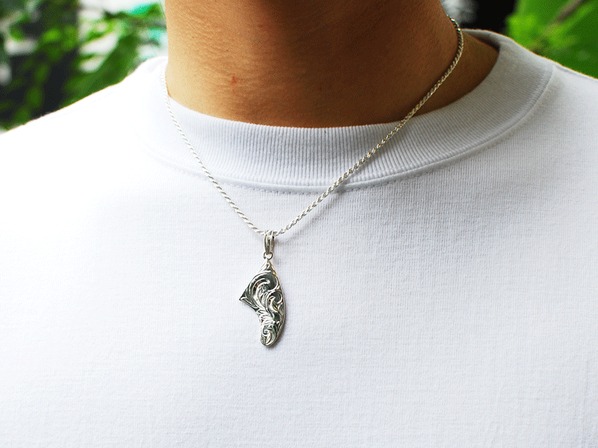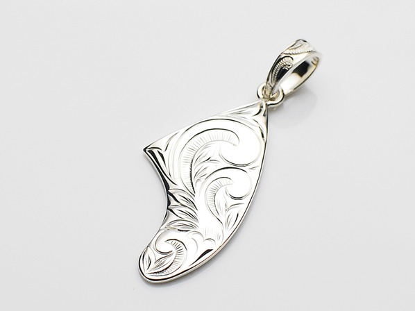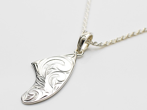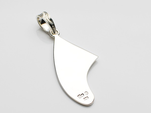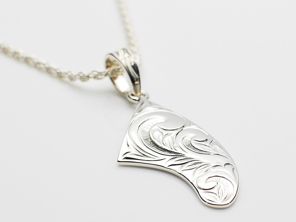 ◆イルカの背びれとサーフボードのフィンをモチーフにしたペンダントで、彫り模様には神が宿るといわれている『キノ・ラウ』をデザインしております。