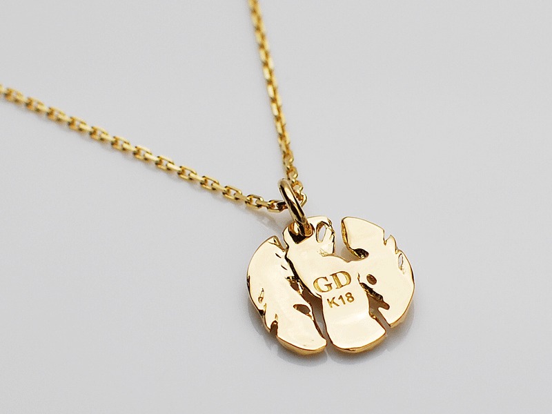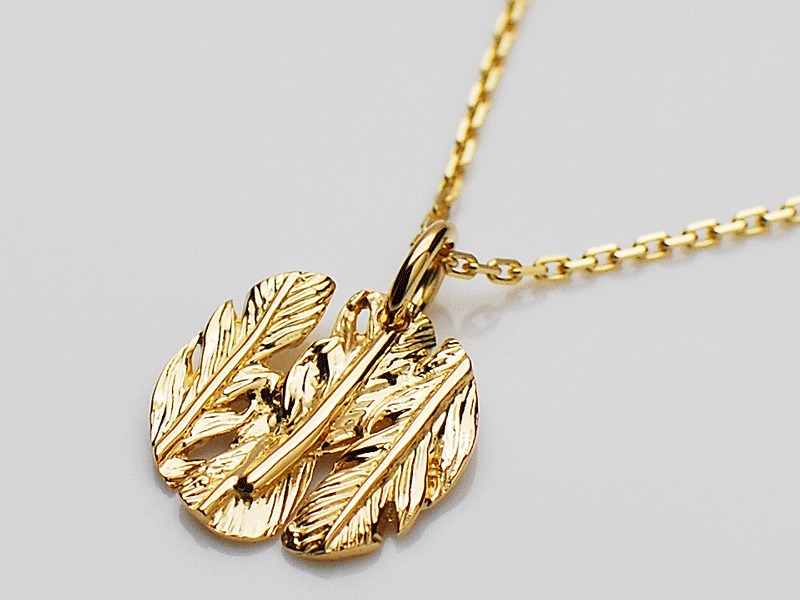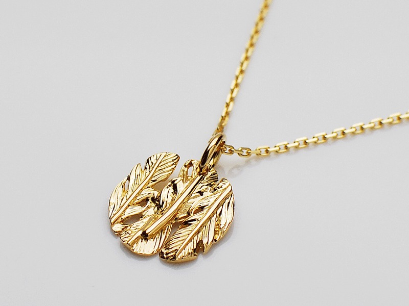 ◆3枚のフェザーで表現したコイン型のK18イエローゴールドネックレスです。