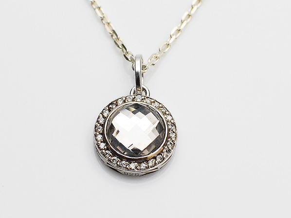 ◆チェッカーカットを施したクオーツを取り囲む様に、キュービックジルコニアを繊細にセッティングしたネックレスになります。