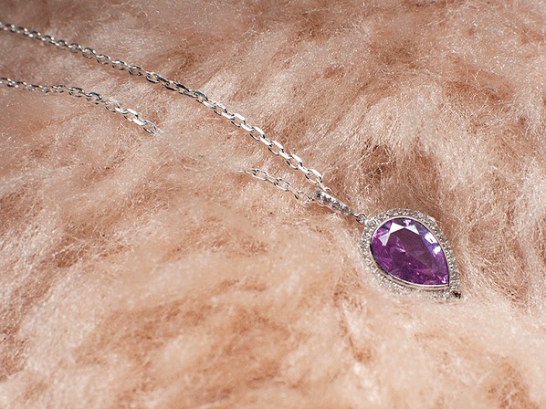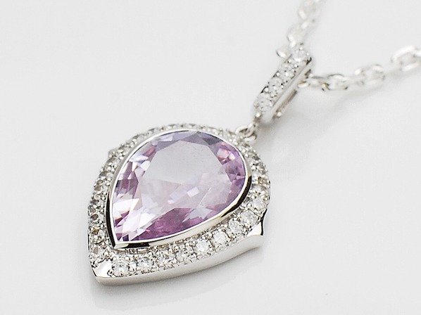 ◆大粒のペアシェイプストーンの周りを包み込むようにセットされた、パヴェセッティングが上品な表情を魅せるオーサムペンダント。(シンセティック・ローズクオーツ)