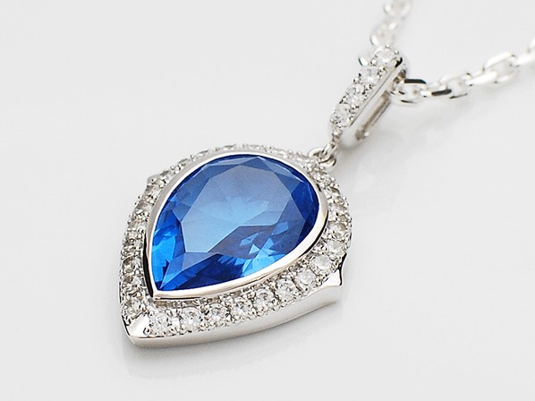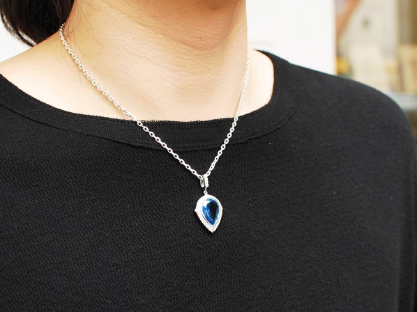 ◆大粒のペアシェイプストーンの周りを包み込むようにセットされた、パヴェセッティングが上品な表情を魅せるオーサムペンダント。(ブルースピネル)