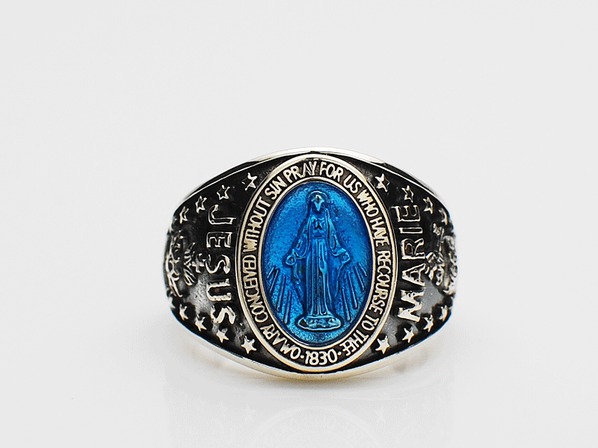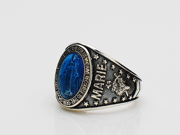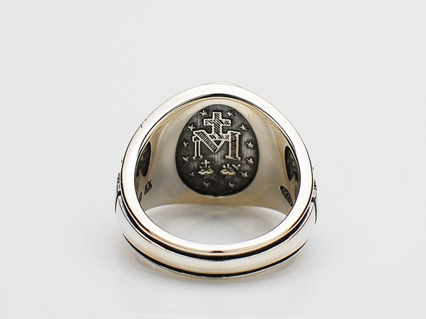 ◆サイドにはマリアとキリストの聖心と協会のシンボルである12個のスターがデザインされ、リング裏に空けられた穴からはメダイの裏が見えます。