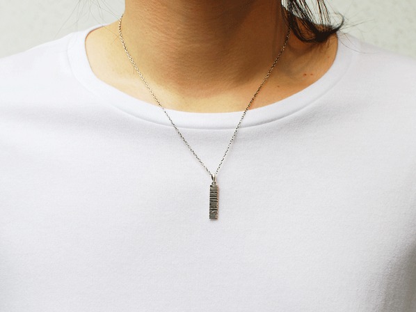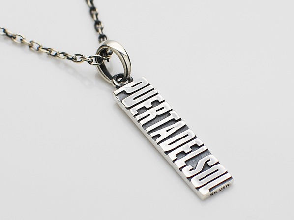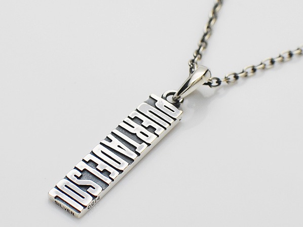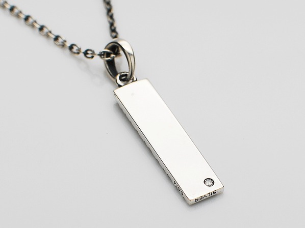 ◆ブランドネームをタイポグラフィー化したプレートネックレスで、ネームが立体的に浮かび上がるような仕上がりとなっています。