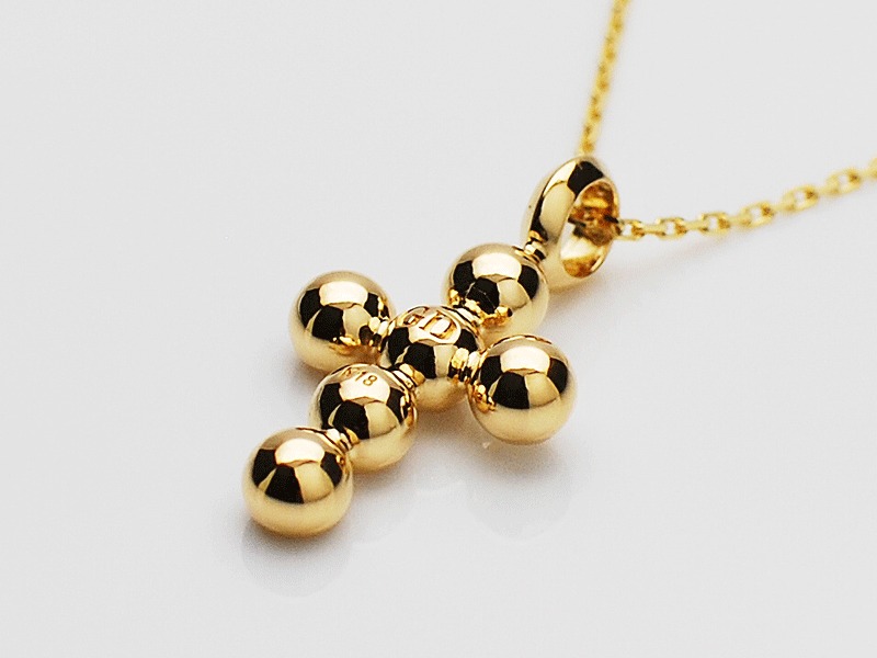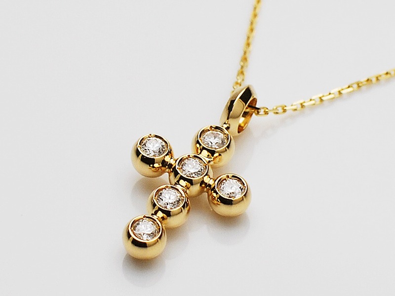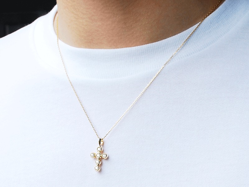 ◆球体を連ねたシンプルでモードなテイストの中に、ダイヤモンドを皿どめしラグジュアリーな雰囲気を纏ったクロスネックレスです。