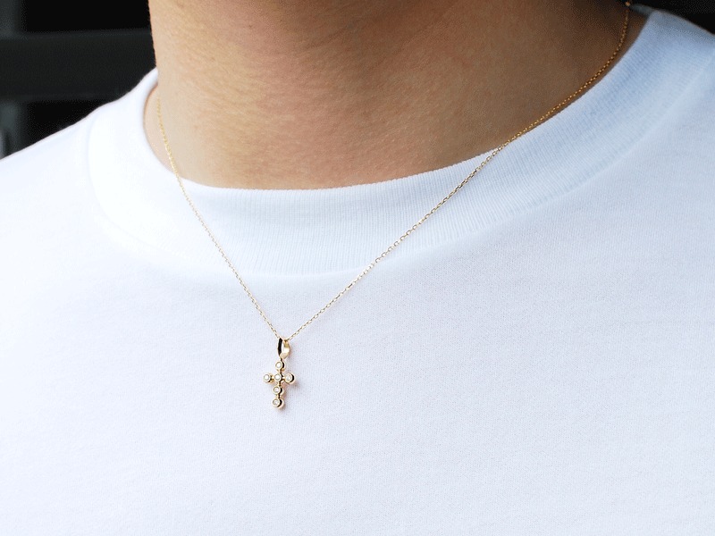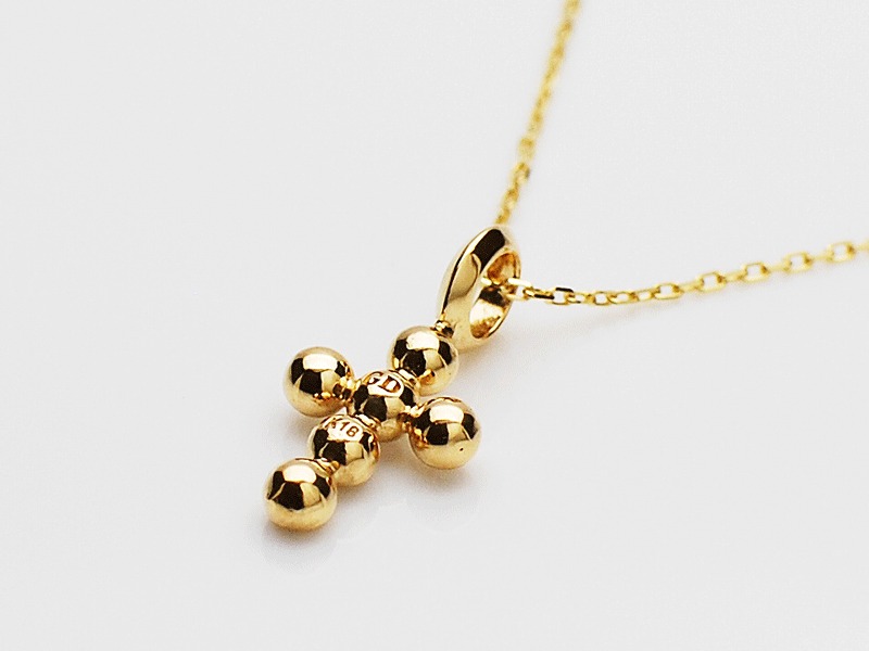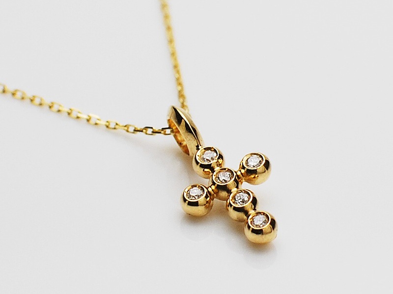 ◆球体を連ねたシンプルでモードなテイストの中に、ダイヤモンドを皿どめしラグジュアリーな雰囲気を纏ったクロスネックレスです。
