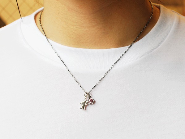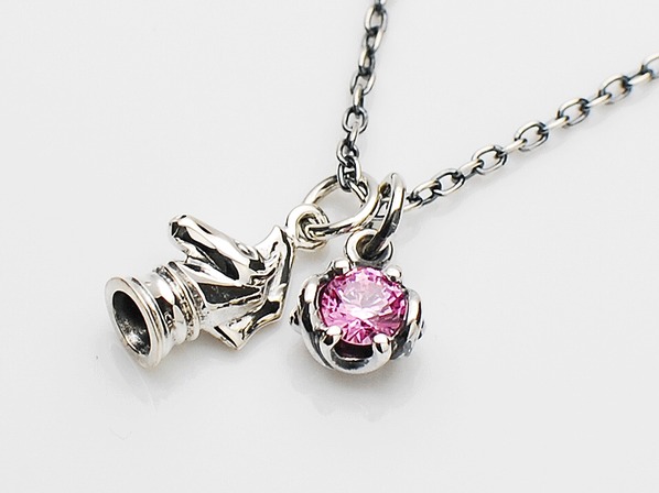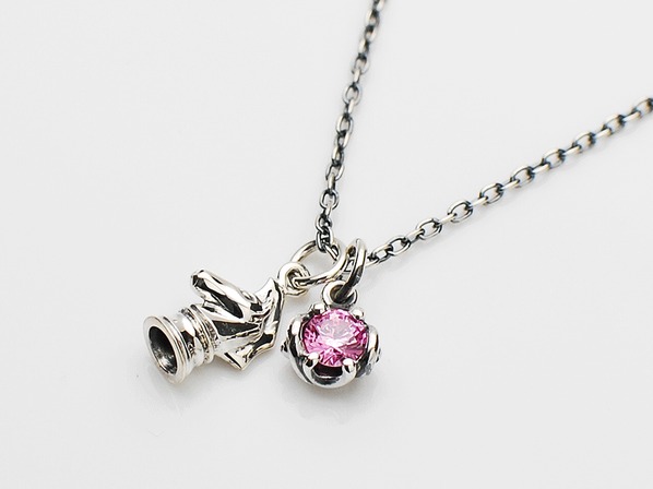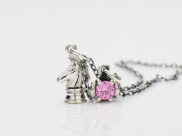 ◆プエルタデルソルのアイコン『ナイト』と唐草の台座に誕生石カラーのジルコニアをセッティングした、ダブルチャームのネックレスです。