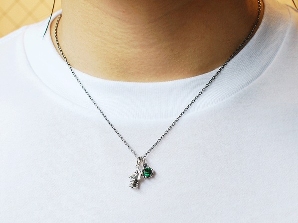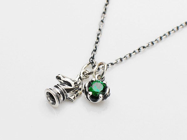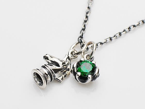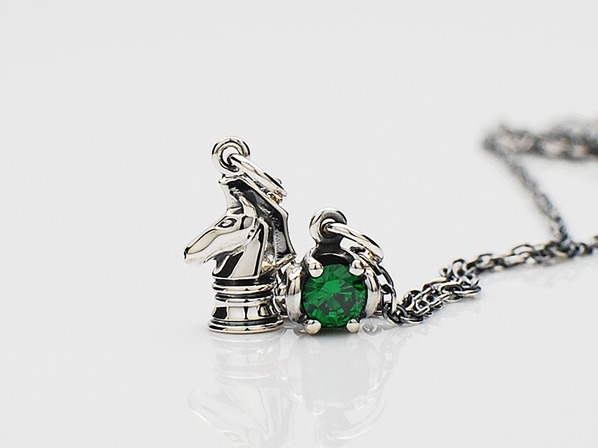 ◆プエルタデルソルのアイコン『ナイト』と唐草の台座に誕生石カラーのジルコニアをセッティングした、ダブルチャームのネックレスです。