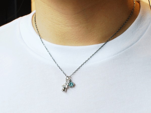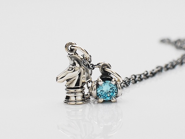◆プエルタデルソルのアイコン『ナイト』と唐草の台座に誕生石カラーのジルコニアをセッティングした、ダブルチャームのネックレスです。