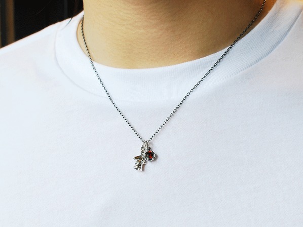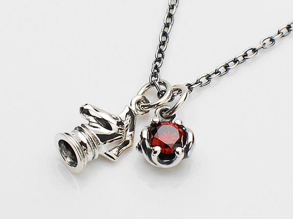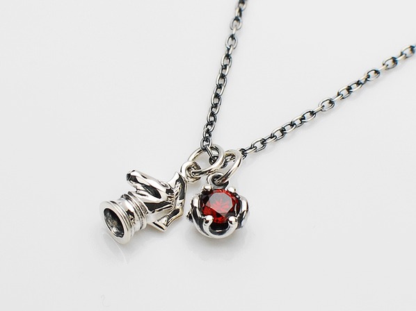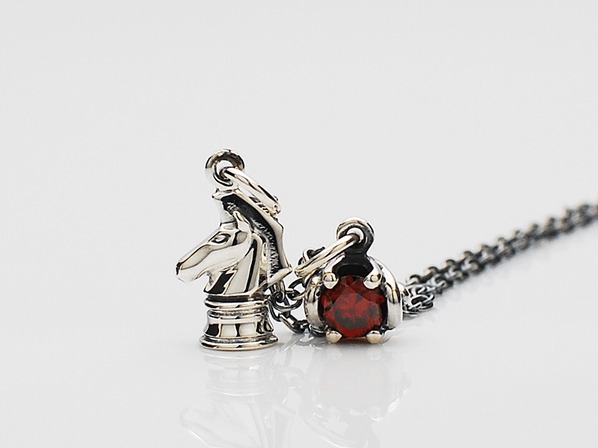 ◆プエルタデルソルのアイコン『ナイト』と唐草の台座に誕生石カラーのジルコニアをセッティングした、ダブルチャームのネックレスです。
