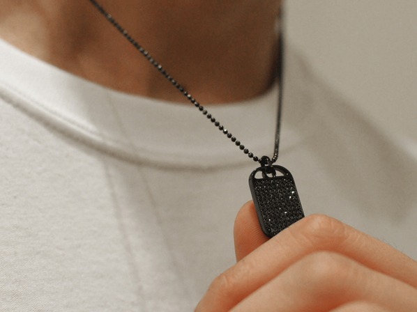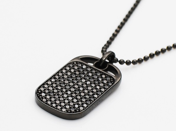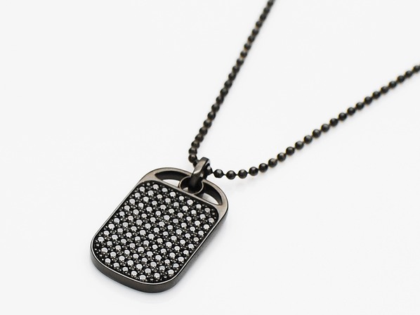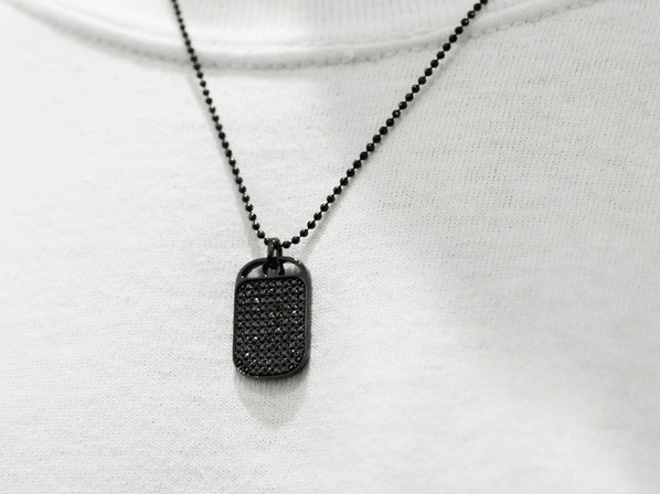 ◆パヴェセッテイングされた100ピースのダイヤモンドを合計すると、1キャラットになる様に計算してつくられたラグジュアリーなドッグタグで、そのブラックジルコニアタイプでブラックコーティングを施したネックレスです。