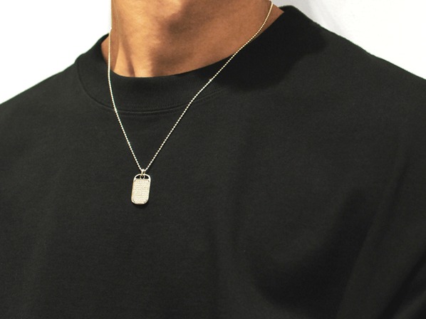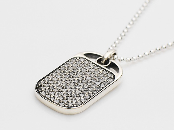 ◆パヴェセッテイングされた100ピースのダイヤモンドを合計すると、1キャラットになる様に計算してつくられたラグジュアリーなドッグタグで、そのジルコニアタイプで燻し加工を施したネックレスです。