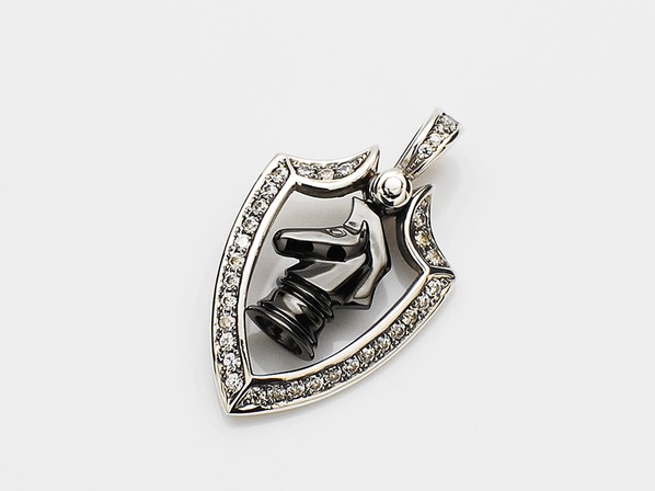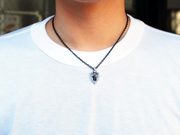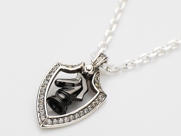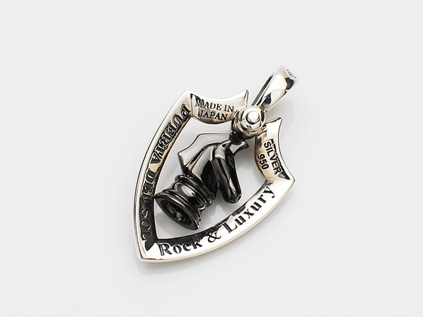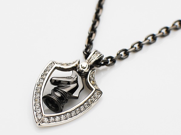 ◆立体的なチェスナイトが中央にセットされたシールド(盾)ペンダントで、裏面にはブランドコンセプトでもある『Rock&Luxury』の文字が刻まれています。