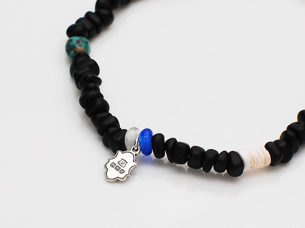 ◆不揃いなターコイズ、貝殻をビーズにしたプカシェル、様々な色のシーグラスをイメージしたガラスビーズ、透き通ったブルーと透明なホワイトハーツ。様々な素材、様々な色が複雑にミックスされたビーズ群。