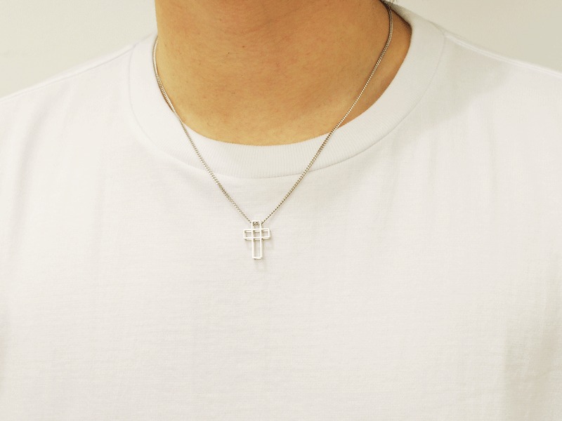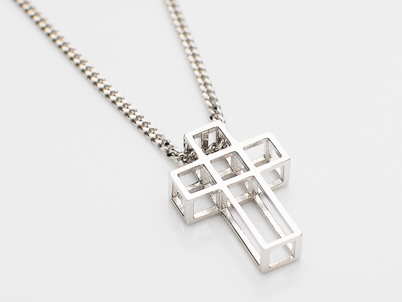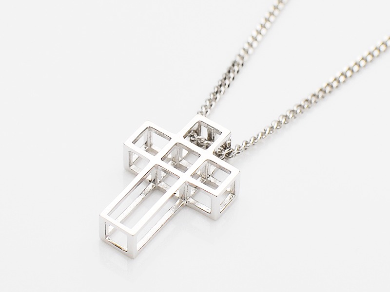 ◆キューブ型のBOXが連なる、モードな雰囲気で立体的なクロスネックレスです。