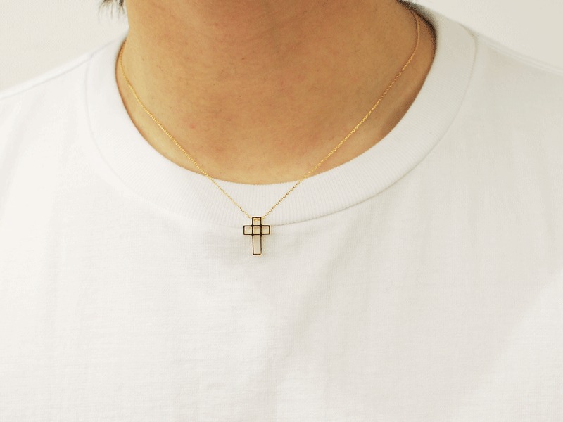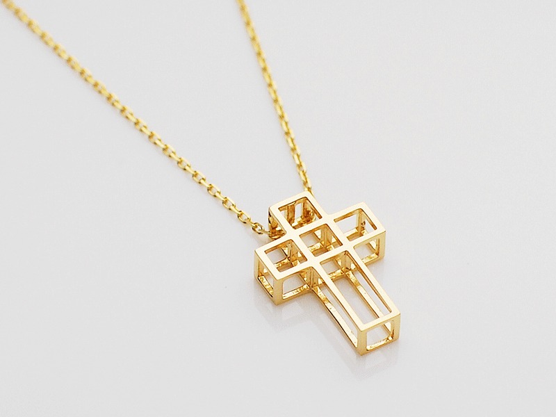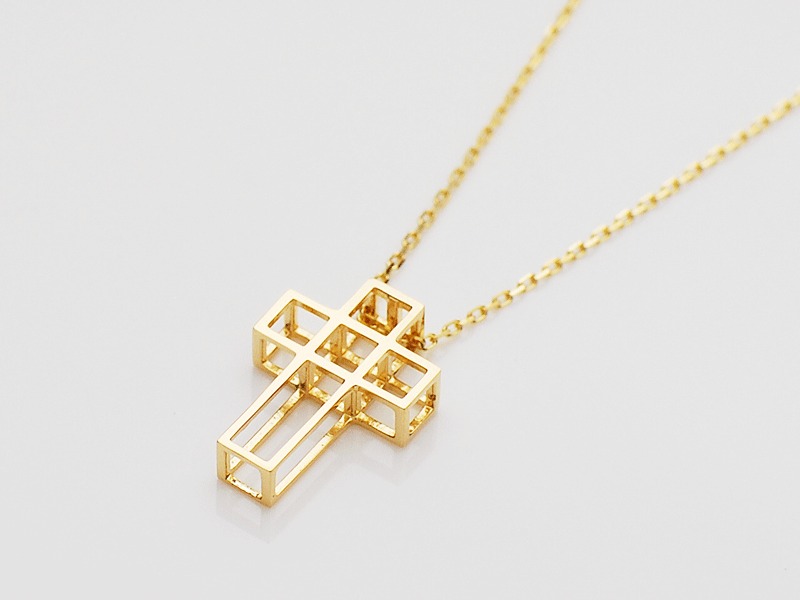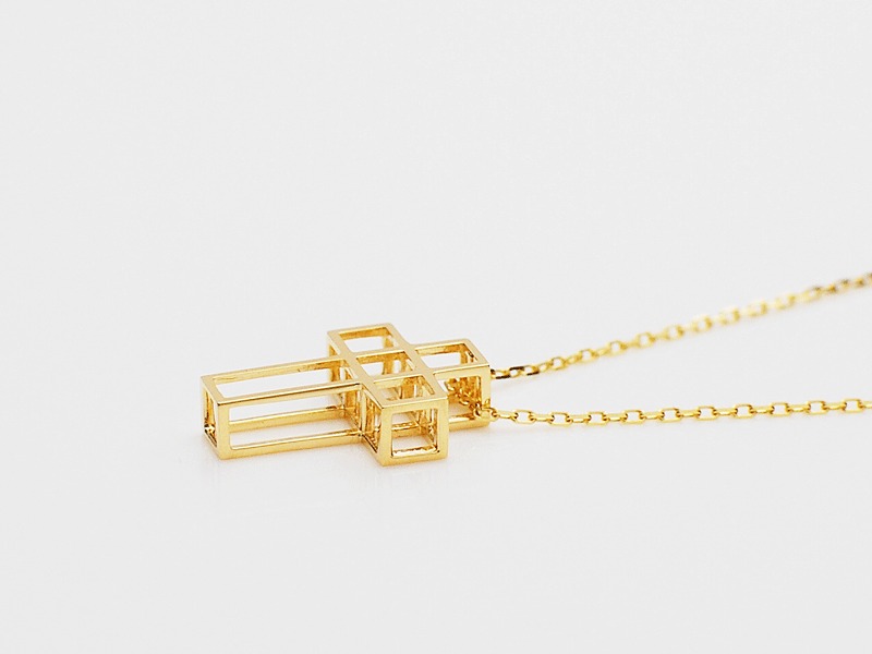 ◆キューブ型のBOXが連なる、モードな雰囲気で立体的なクロスネックレスです。
