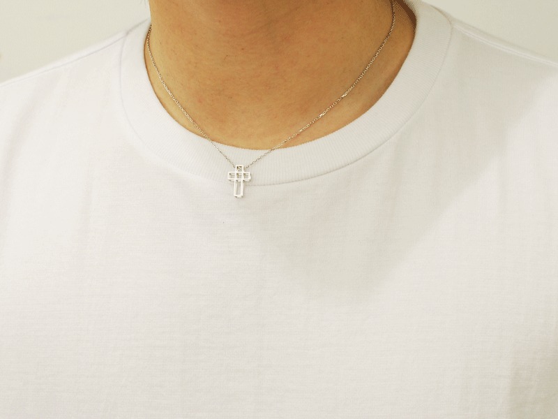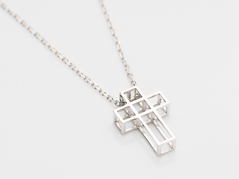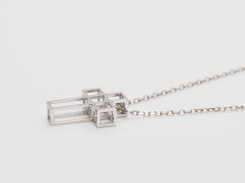 ◆キューブ型のBOXが連なる、モードな雰囲気で立体的なクロスネックレスです。