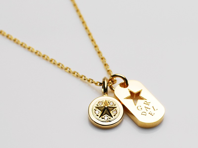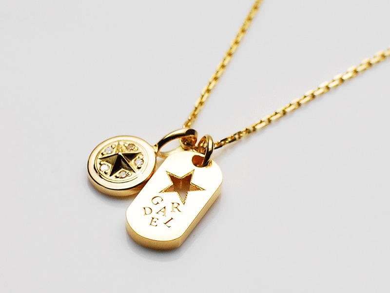 ◆ガーデルらしいエッジの効いたR.STAR DOG TAG PENDANTと繊細なダイヤモンド使いのLUCE STARをダブルで使用した、ラグジュアリーで軽快なネックレスです。
