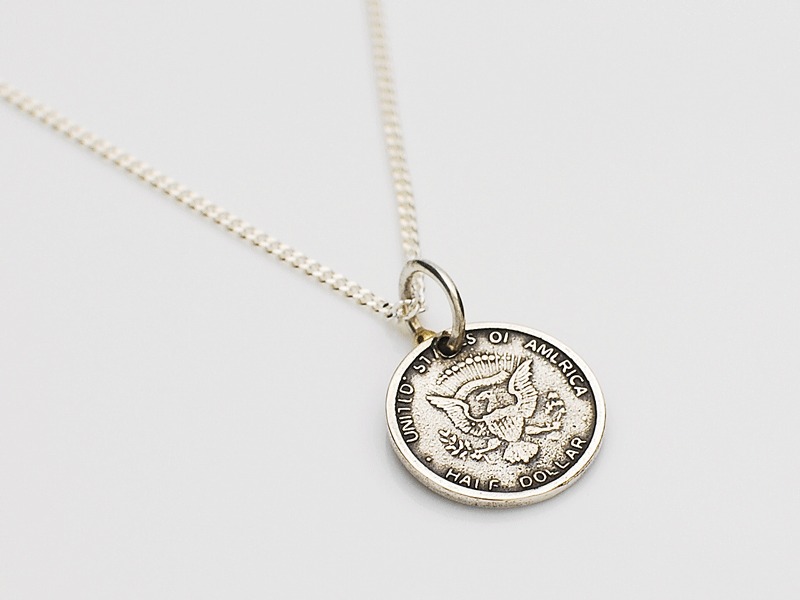 ◆1963年11月22日、第35代アメリカ合衆国大統領ジョン・F・ケネディはテキサス州ダラスにて、現地時間12時30分、狙撃にて暗殺される。翌年発行されたケネディが描かれた50C硬貨をモチーフにしたネックレス。