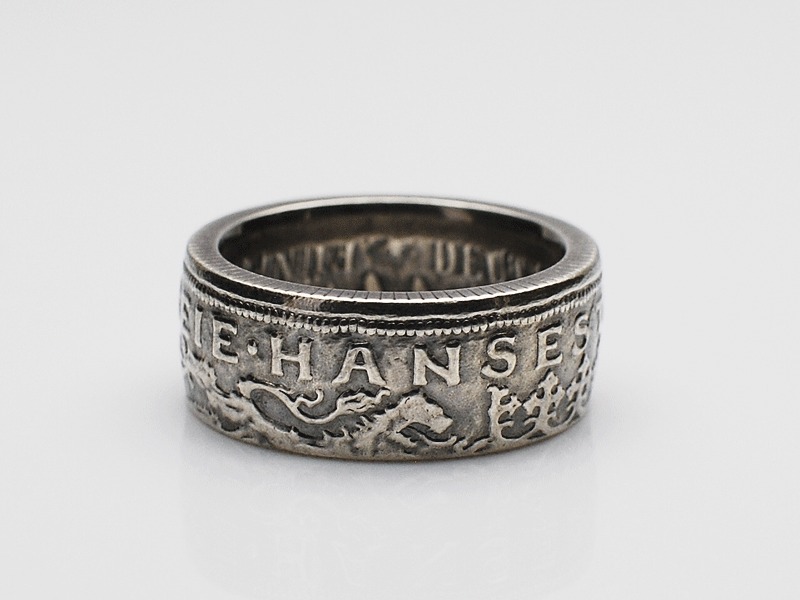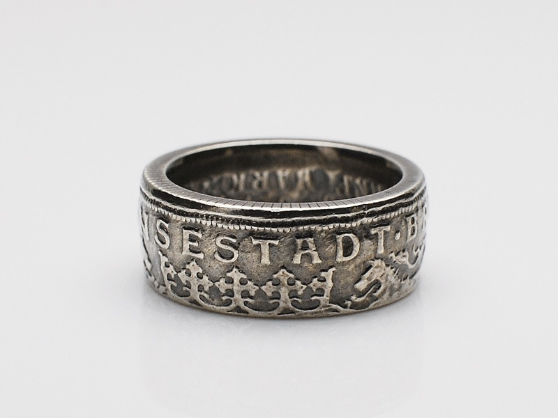 ◆ドイツのクラシックコインの真ん中に穴を開け、何度もプレスしながらリング状に形成し仕上げられた、コインの美しさが最大限に引き出されたリングです。