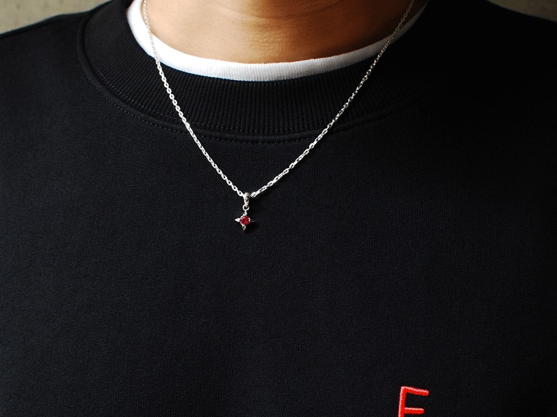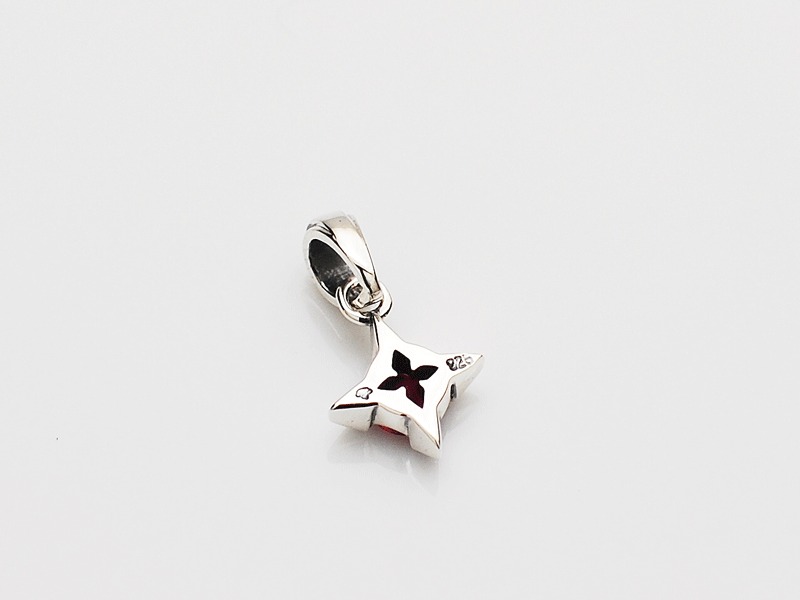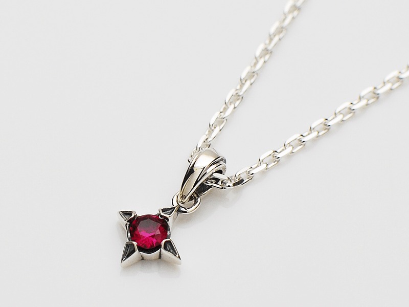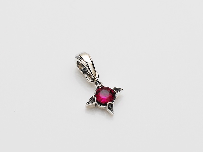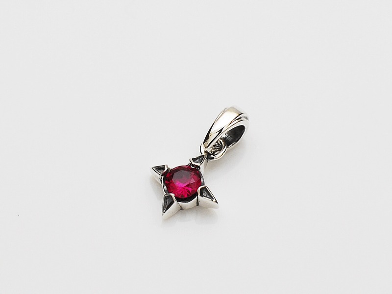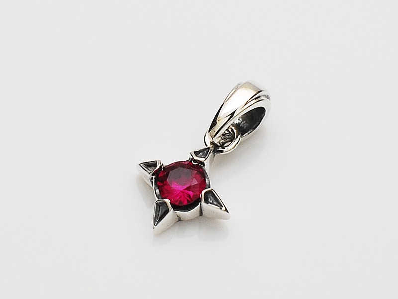 ◆菱形にデザインされた爪でシンセティックルビーを留めているワンストーンチャーム。