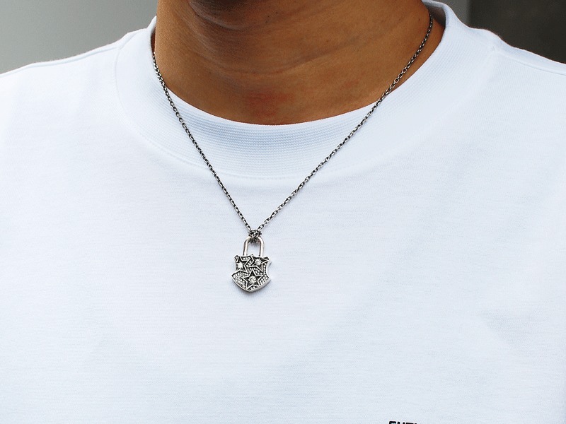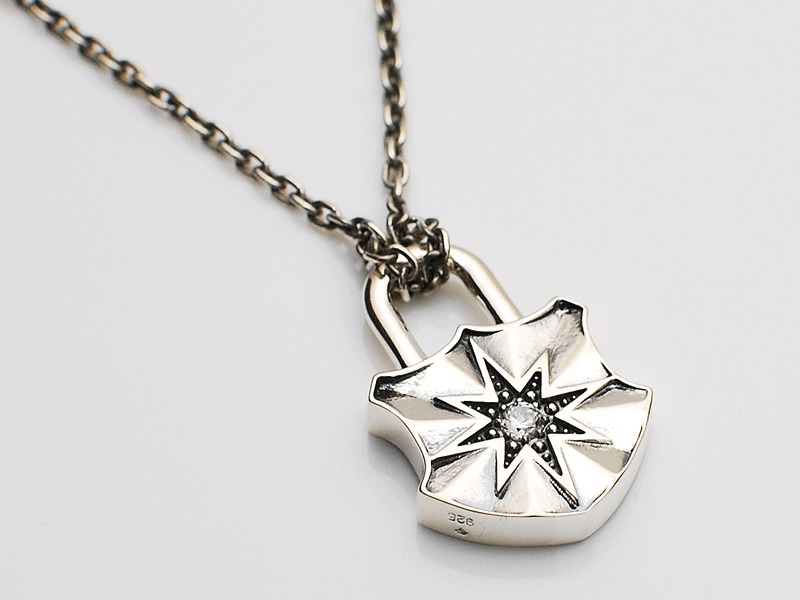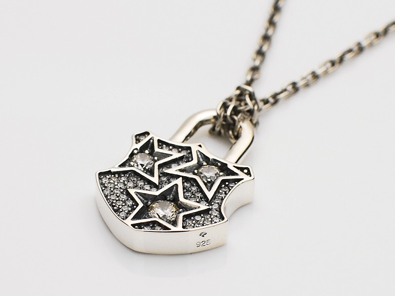 ◆満点の星空に3つのスターが煌びやかに輝く情景を錠前ペンダントに落とし込んだ、星空をLOCKするパドロックネックレス。