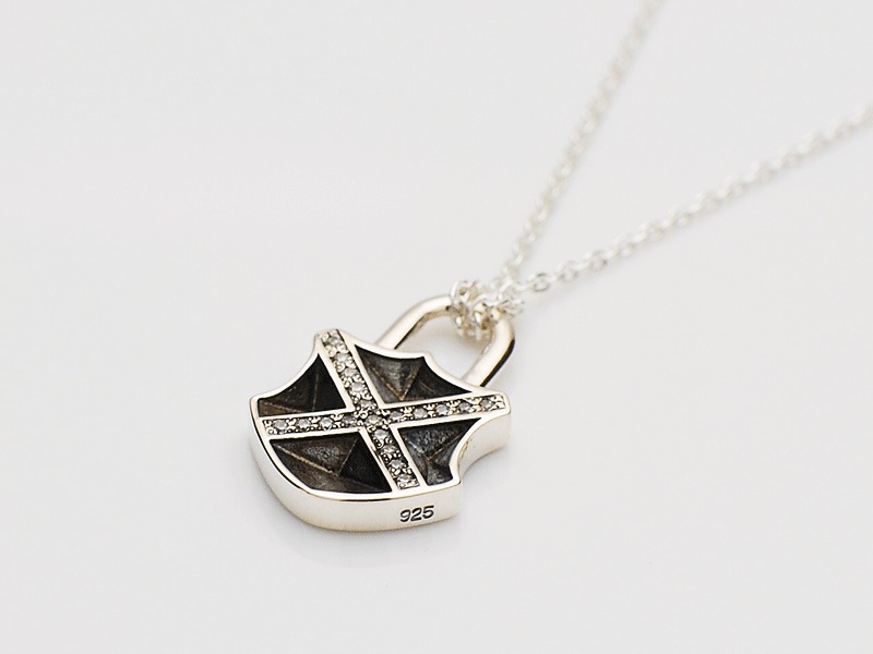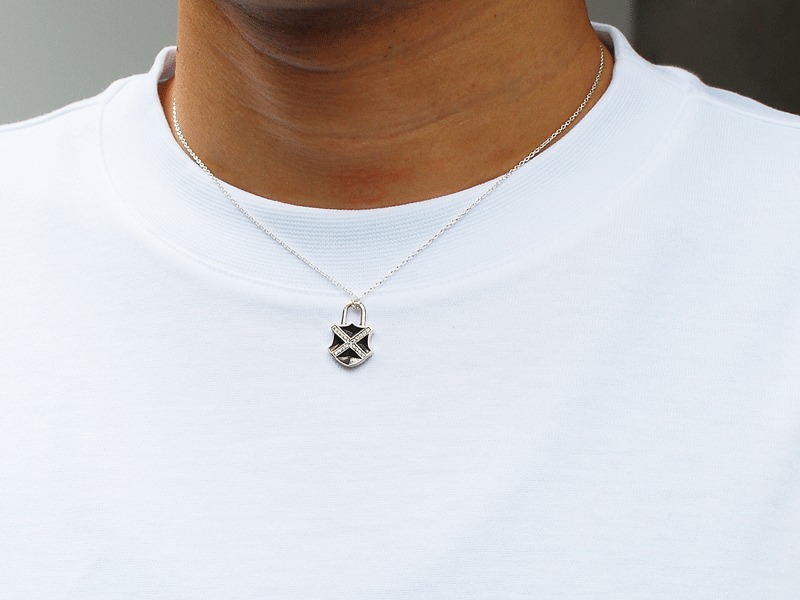 ◆Xのストーンラインとカービングが印象的なパドロックネックレス。