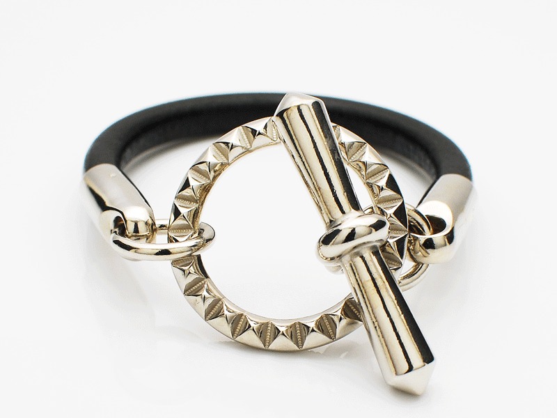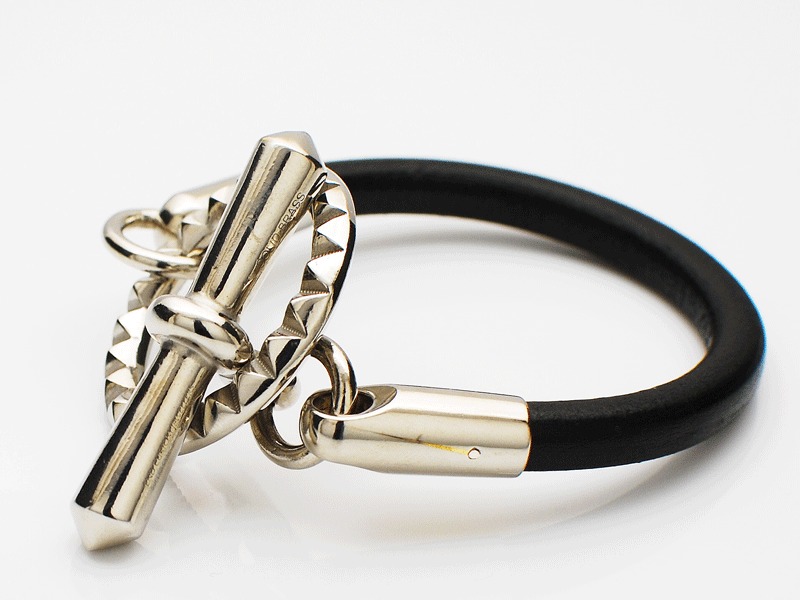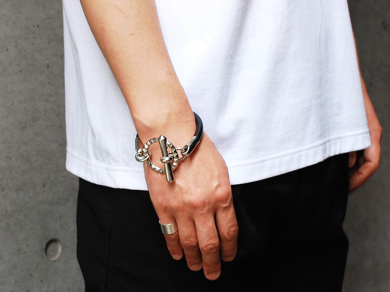 ◆太めのブラックレザーとボリュームのあるピラミッドサークルが特徴的な、ENDらしいモード感漂うブレスレットです。