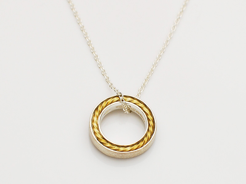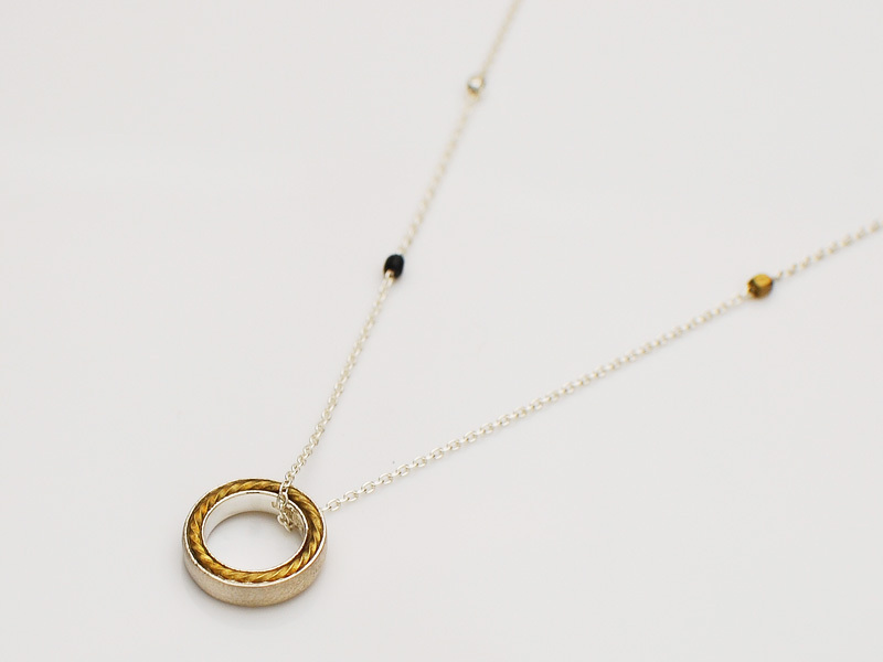 ◆ツイストしたゴールドブラスワイヤーをリングの両サイドにインサートしたリングトップが象徴的なネックレス。
