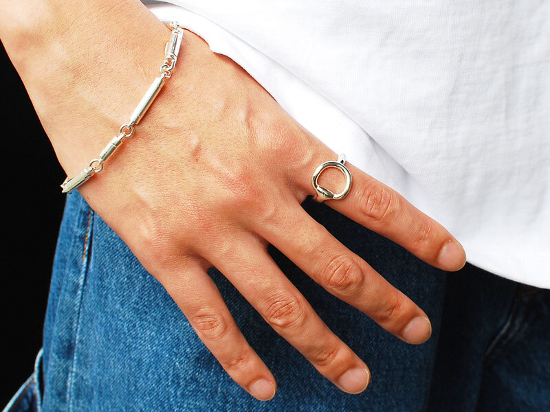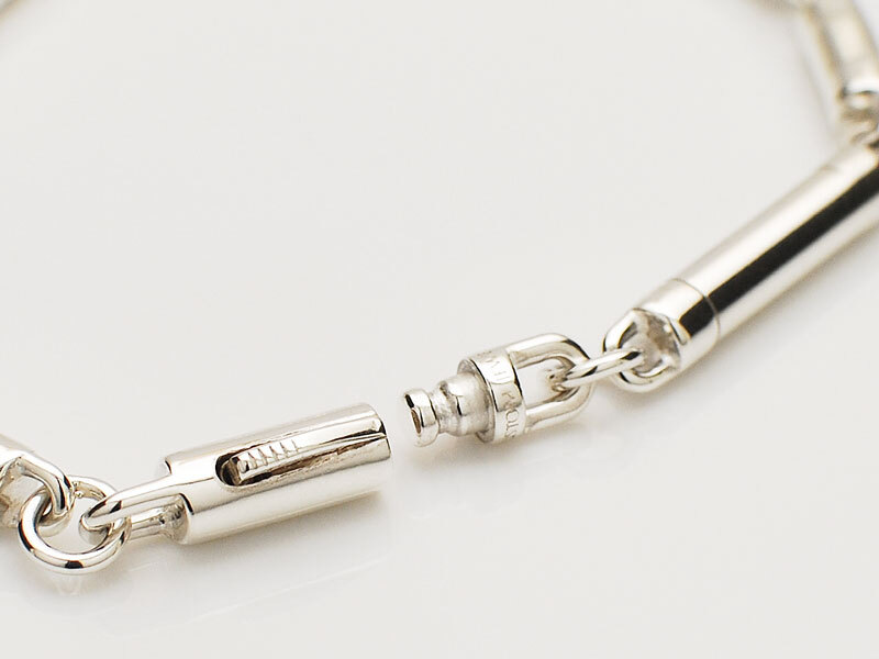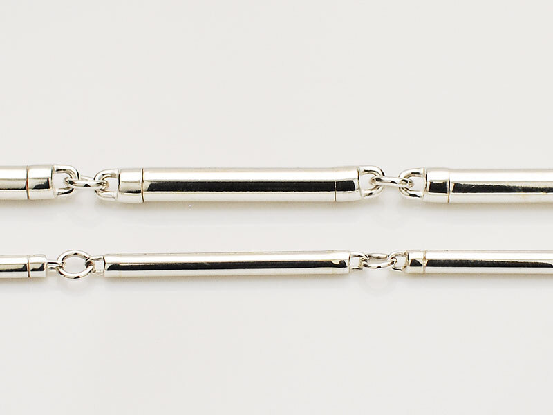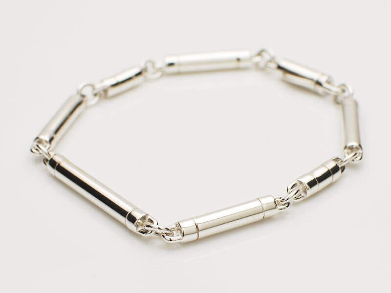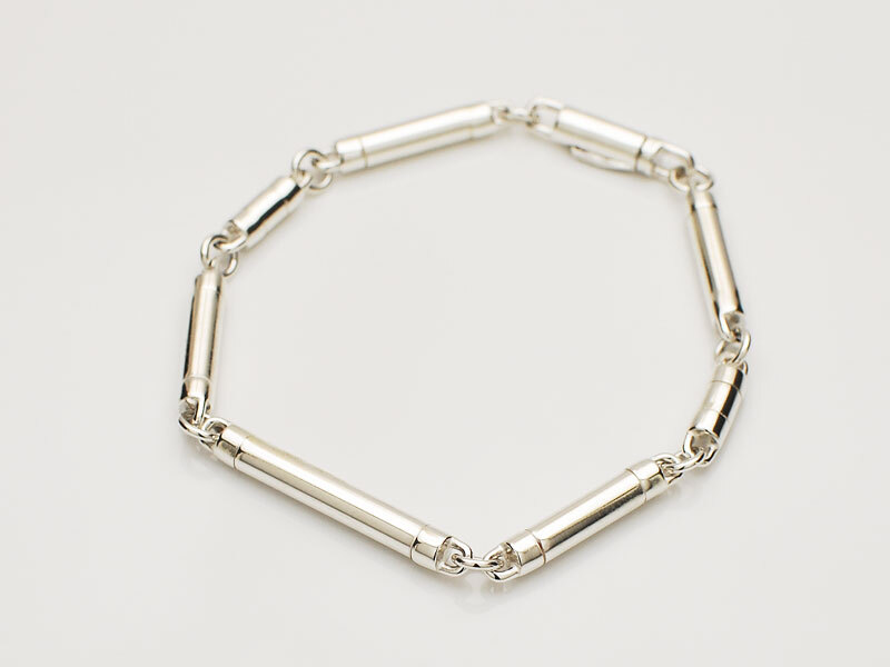 ◆シリンダー型のパーツで構成されたミニマルなチェーンピースモデルのブレスレット。
