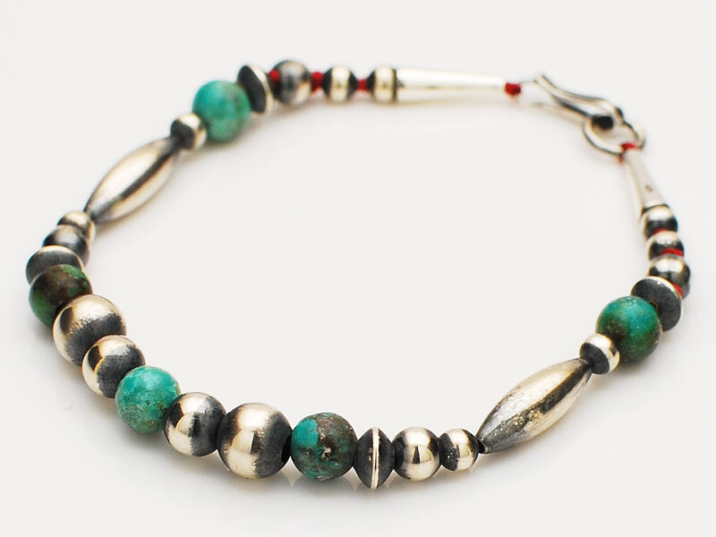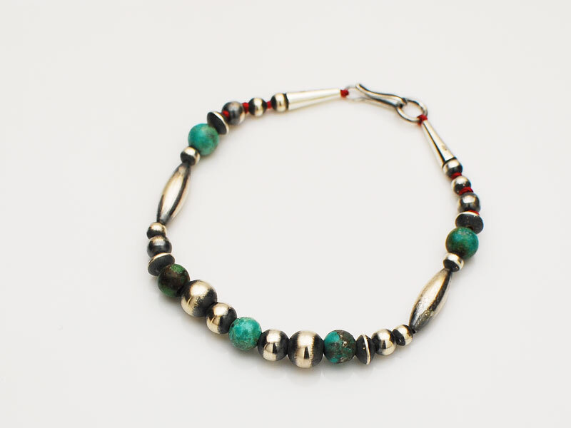◆4種類のサイズのラウンドビーズを主体に、ラウンドターコイズビーズを差し込みロンデルビーズとライスビーズをアクセントに組み上げました。燻し、磨き上げたシルバー925製ナバホパールは一粒一粒が味わい深く輝きます。