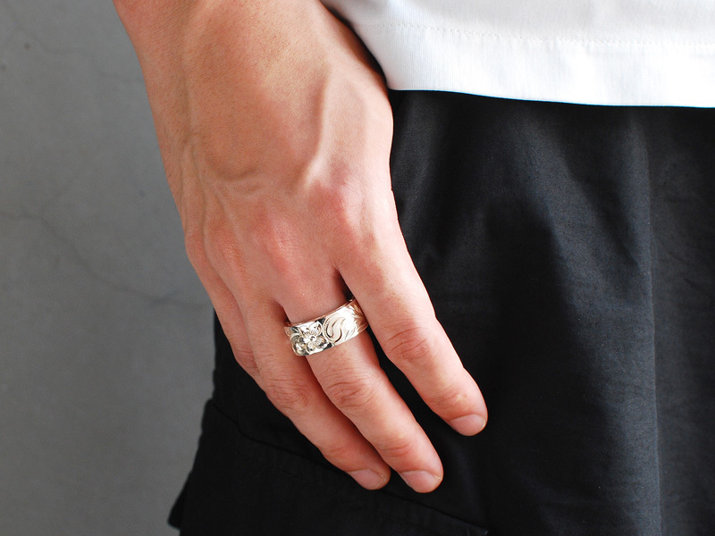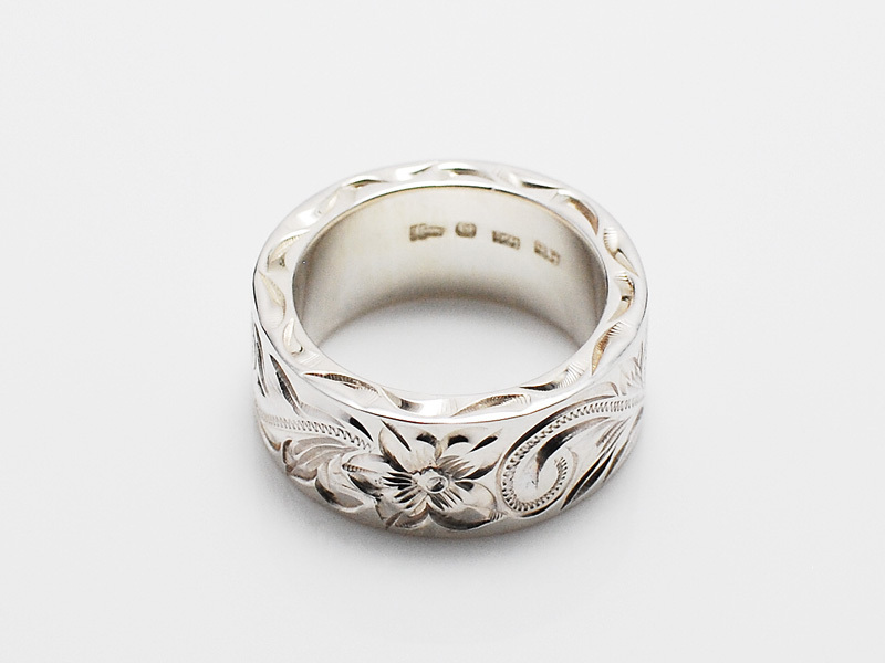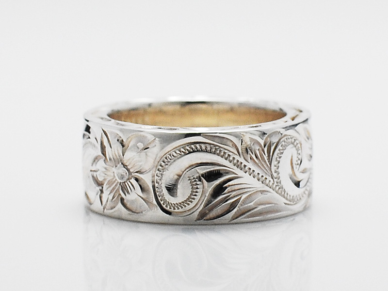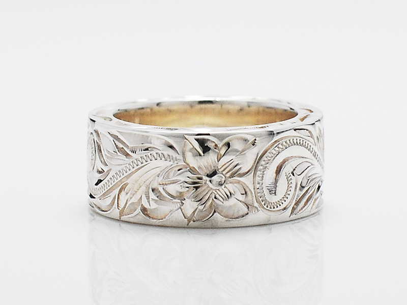 ◆彫り模様にはLonoオリジナルのオールドイングリッシュというプルメリアとスクロールが描かれたフラットリングで、側面にもスクロールの彫り模様が入っています。